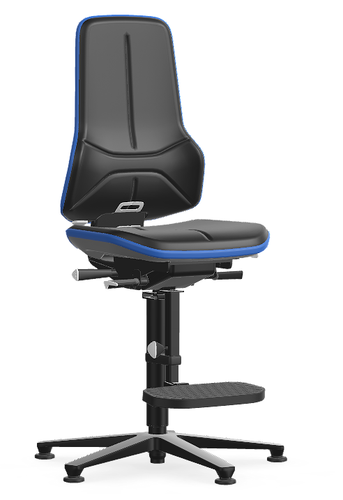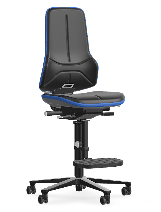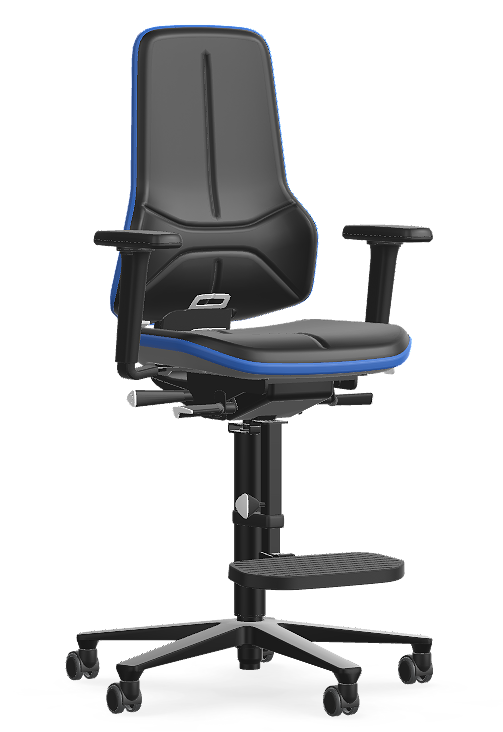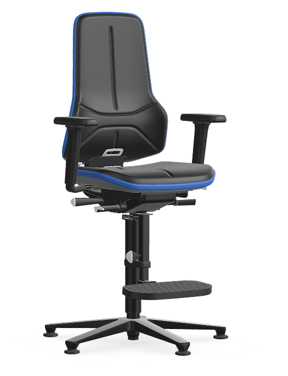 Werken aan verhoogde opstellingen in productiefaciliteiten vereist een stoel die stabiliteit combineert met bewegingsvrijheid. De NEON 3 is standaard uitgerust met een uitgebreid ergonomiepakket om te voorkomen dat gebruikers in onnatuurlijke houdingen worden gedwongen. De stoel is voorzien van glijders voor maximale stabiliteit op hoogte en een verstelbare voetensteun voor een ergonomische zithouding.