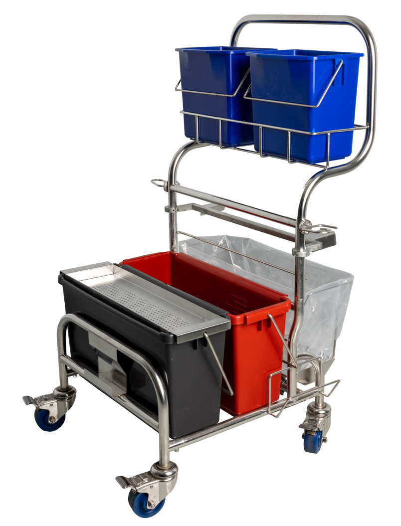 De gehele RVS trolley is 100% autoclaveerbaar (veilig te steriliseren bij 121°C gedurende 30 minuten). Dit maakt het systeem geschikt voor gebruik in zeer kritische cleanroomomgevingen. De keuze voor RVS-emmers versterkt de geschiktheid voor de meest gevoelige processen.