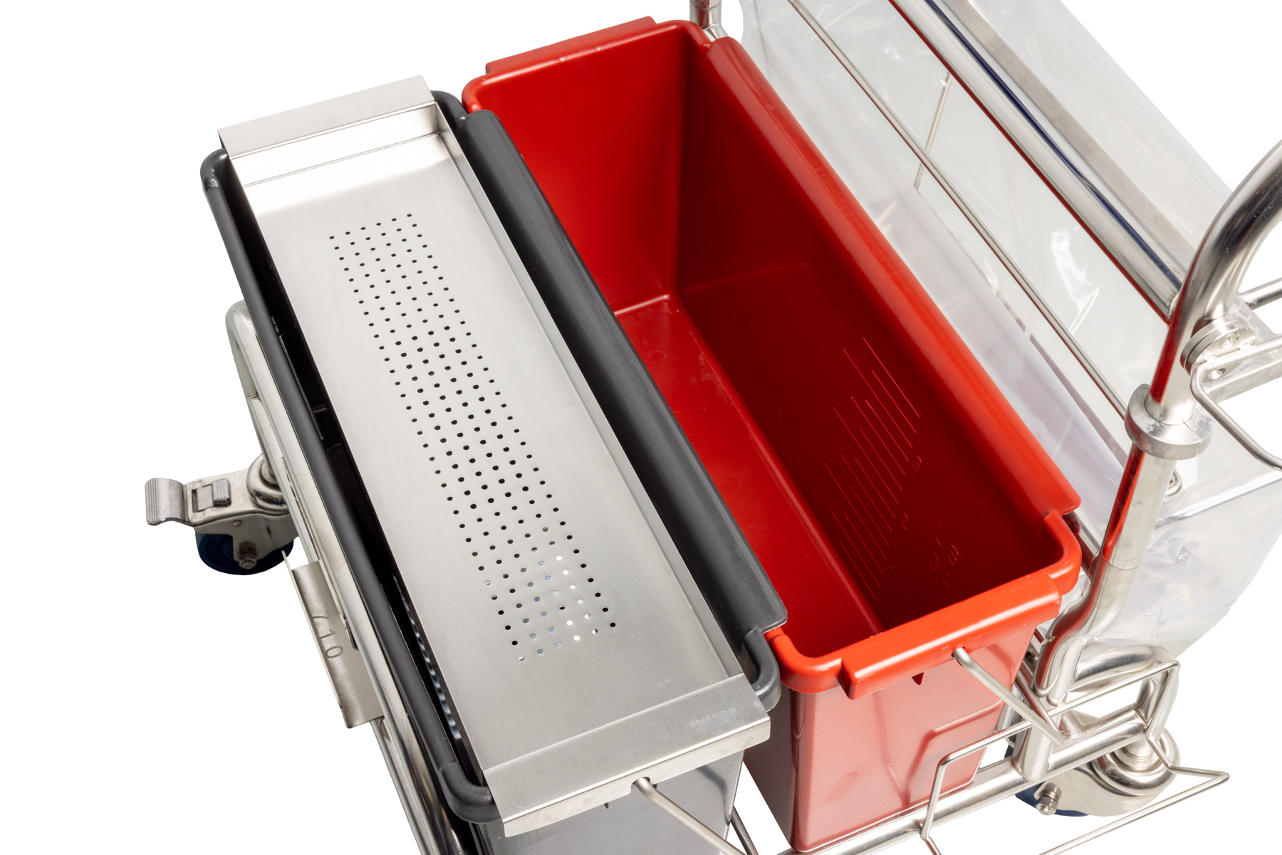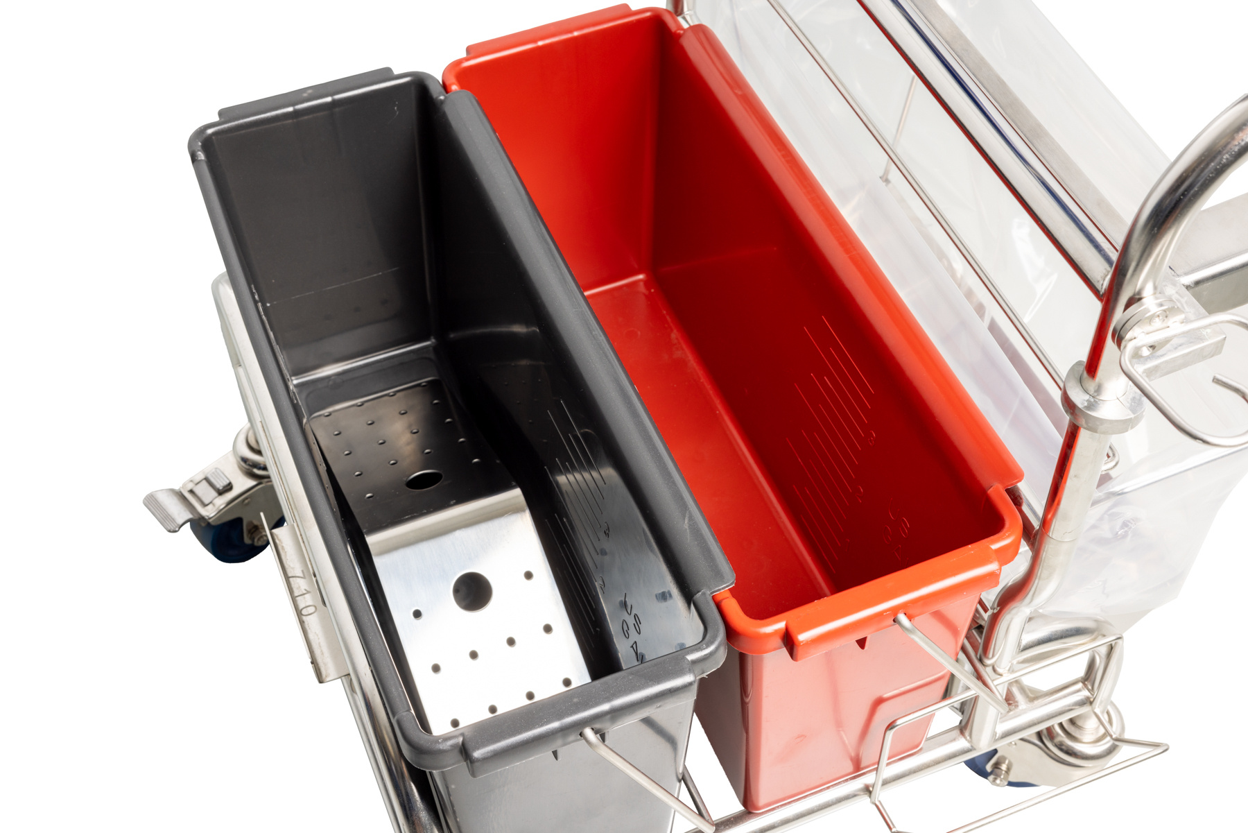 | Vier roterende, vergrendelbare zwenkwielen | Uitstekende wendbaarheid; de trolleypositie kan veilig worden vastgezet tijdens reinigingstaken. |