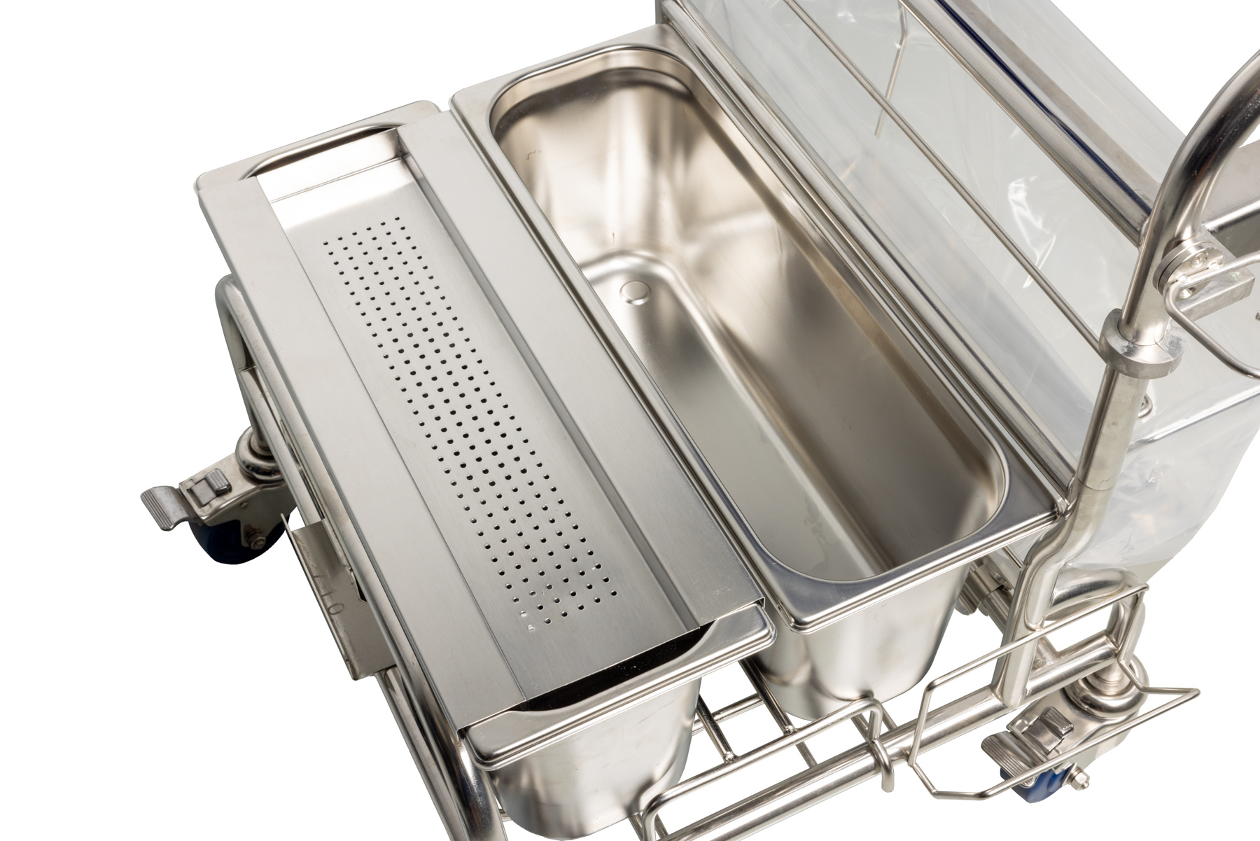 - Wendbare cleanroom trolley: De kar is uitgerust met vier autoclaveerbare zwenkwielen, wat de wendbaarheid verhoogt, ideaal voor zowel kleine cleanrooms als krappe productieruimtes.
