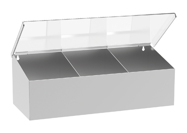 RVS dispenser voor consumables met 3 vakken voor de opslag en uitgifte van cleanroom consumables. Met transparante deksel.