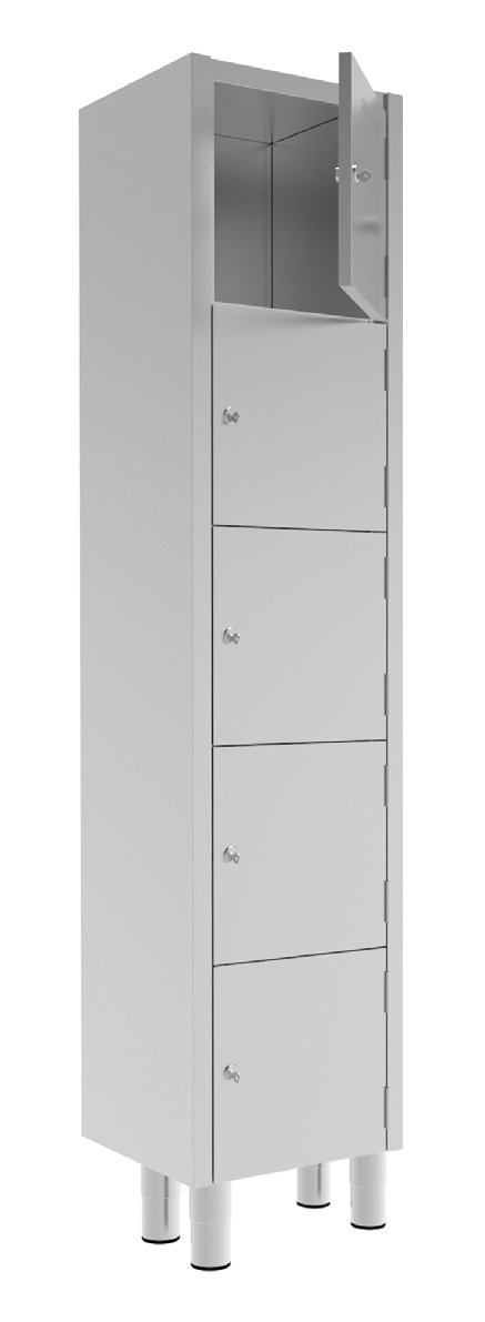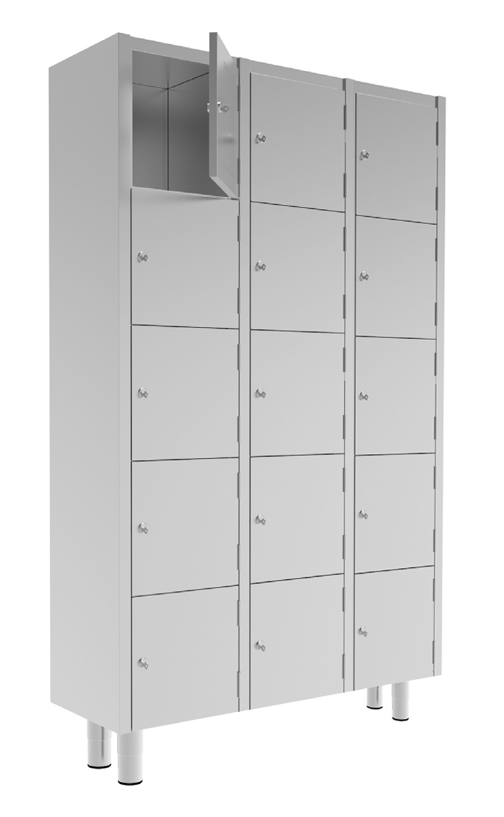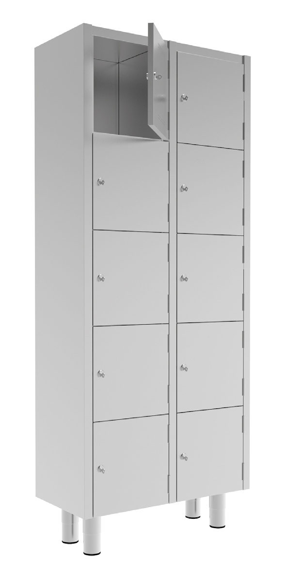 Deze hoge kast met 5 tot 15 persoonlijke lockers is ontworpen voor het gebruik in de PAL-omgeving van cleanrooms. De hoge lockerkast is vervaardig uit RVS AISI 304 met scotch brite afwerking.