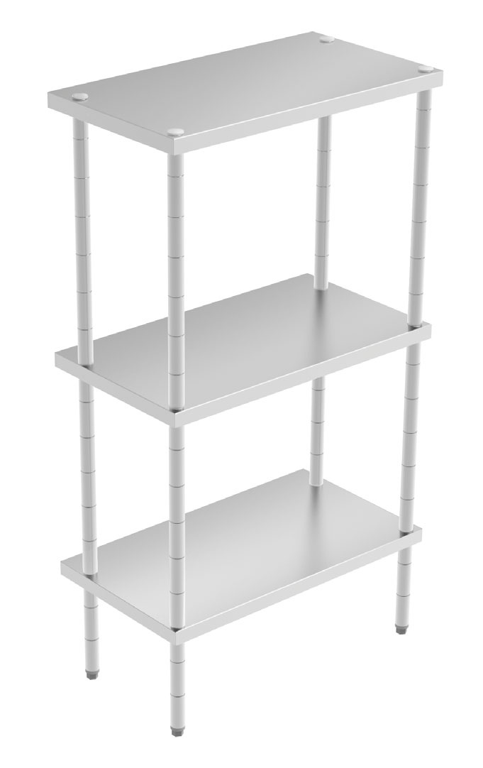 Het rek is ontworpen om mee te groeien met uw behoeften. De staanders zijn vervaardigd uit robuuste buizen van Ø38 mm, wat zorgt voor een uitstekende stabiliteit en een hoog draagvermogen. Met de drie meegeleverde dichte legborden creëert u een hygiënische opslagruimte die volledig naar wens is in te delen; de borden zijn namelijk om de 100 mm in hoogte verstelbaar.