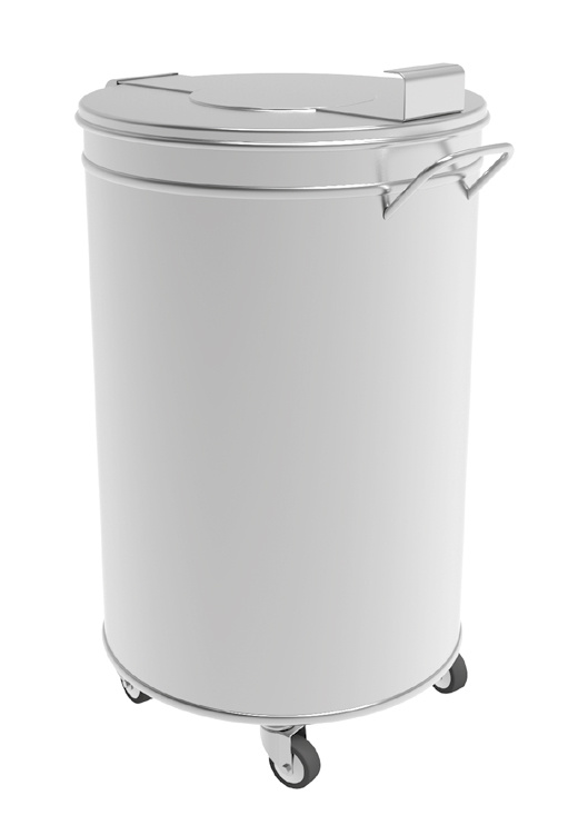 Ronde RVS afvalemmer op wielen geschikt voor gebruik in cleanroomomgevingen. de RVS afvalemmer is verkrijgbaar in drie verschillende maten.